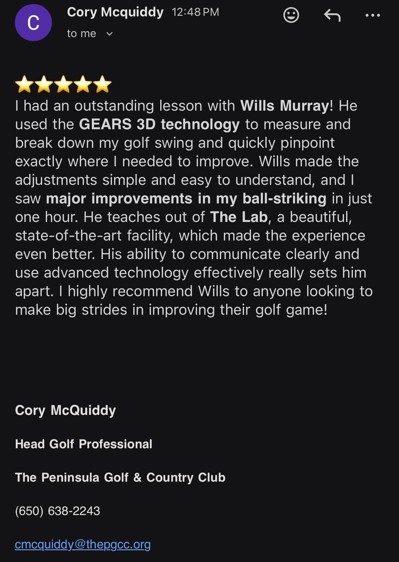 Will's strength lies in quickly identifying the key bottlenecks in a golfer’s swing or overall game, and developing a focused, data-driven plan for meaningful improvement. Whether working with top amateurs or seasoned players, Wills is committed to helping each student unlock their full potential through precise analysis and smart coaching.